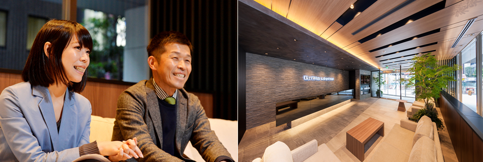 左)東京建物の萬さんと遠藤さん 右)同社のマンションブランド「Brillia」を冠したブリリアラウンジ