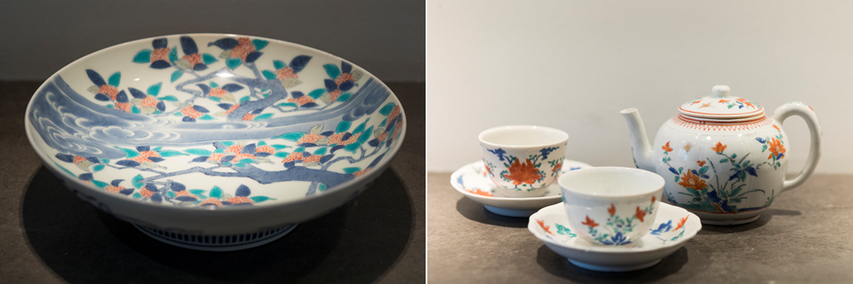 右)『柿右衛門 色絵花文カップ&ソーサー、盃・托、水注 江戸時代 17世紀末』 柿右衛門様式は、花鳥図などを左右非対称に余白をもって描き、白磁の白さが色絵の美しさを生かしている