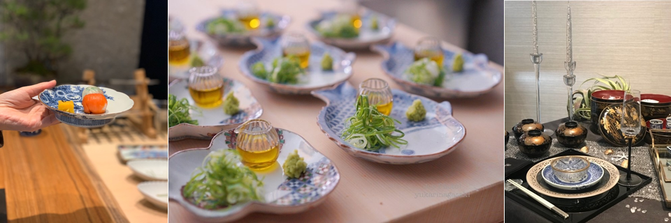 左・中)「五感で感じる器セミナー」のひとこま。参加者は食事を楽しみながら、古伊万里の知識や料理の盛り付け方などを学ぶことができる