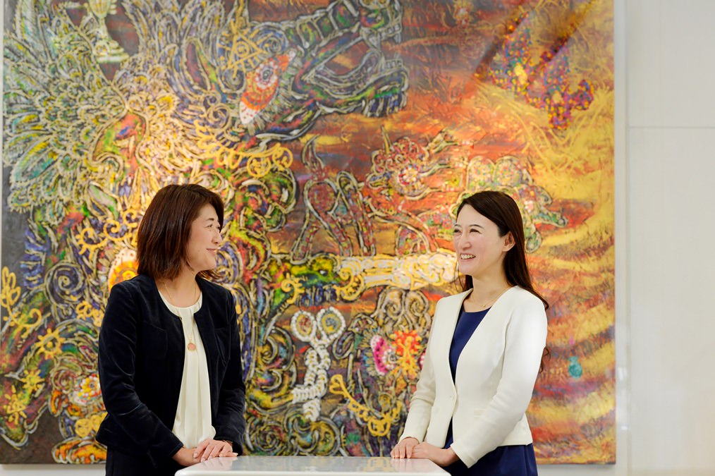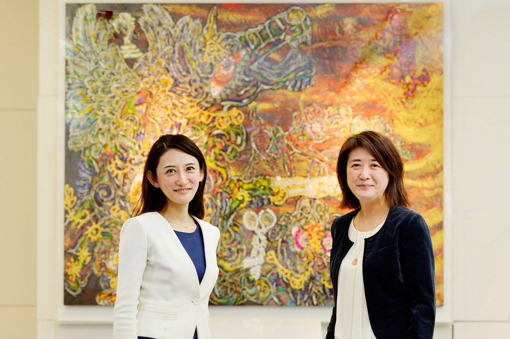 SMBC信託銀行 プロダクト企画部アート企画推進担当・岩崎かおりさん(右)と、SMBC信託銀行 日本橋支店副支店長の良知和恵さん(左)。おふたりの背後にある作品は舘鼻則孝『Embossed Painting』シリーズ (2020年3月取材時)