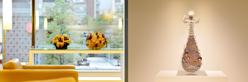 第1回アートブランチで展示された作品。左:桑田卓郎『茶碗』右:名和晃平『PixCell-Biwa#2(Mica)』(2020年3月取材時)