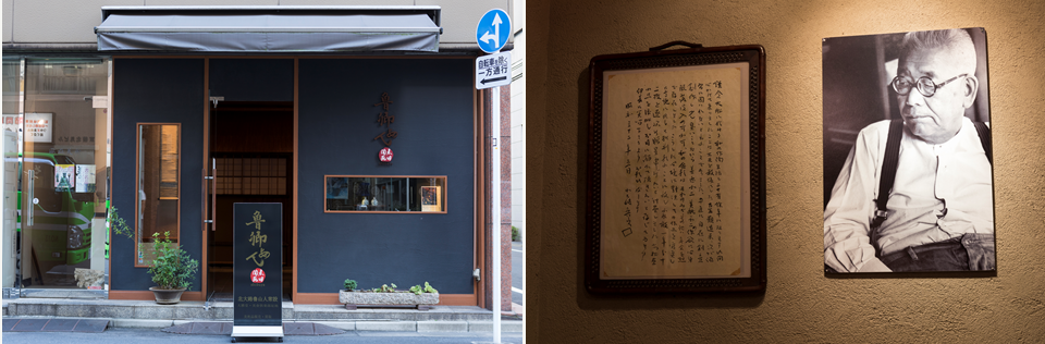 左)魯山人が手掛けた大雅堂美術店および美食倶楽部の跡地にて魯山人作品を展示する、古美術店・魯卿あん入口