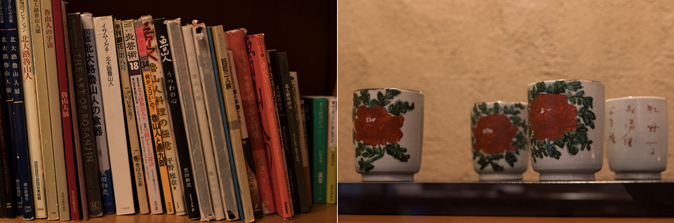左)魯卿あん店内の書棚には魯山人の関連書籍がずらり並ぶ