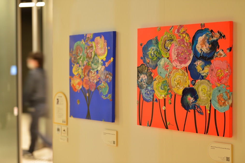 実際の色数よりもカラフルに感じられる画面には、これまでのシリーズで培ってきたグラデーションの技法を応用した。オフィス街の展示については、「感謝がテーマなので、人に見てもらわないと始まらない。作品がふと目に入ったら、自分はなぜその花や色に惹かれたのか、普段は振り返らない自分の感性を見直す機会にしてもらえたら」と語る。