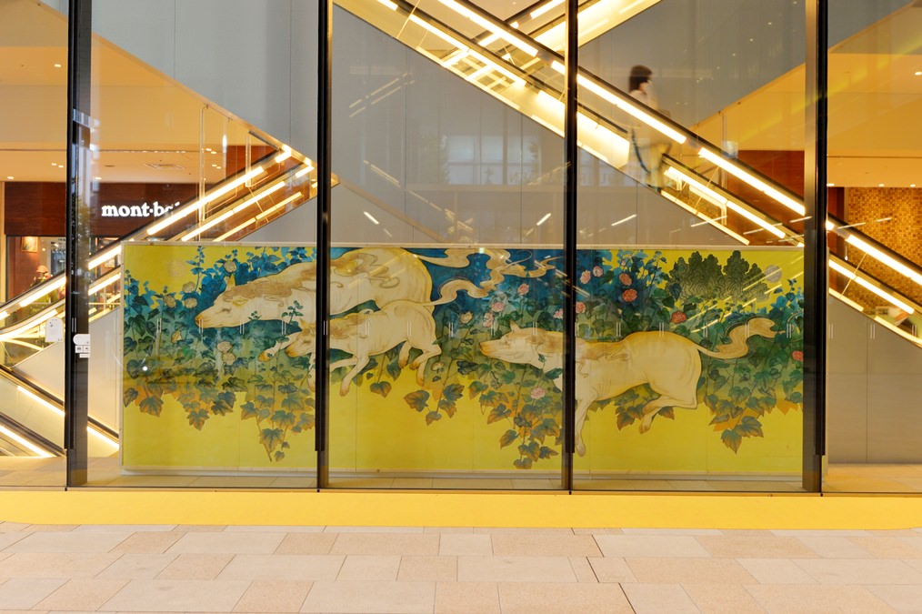 多くの作品が並ぶエントランスを外に出ると、正面のガラス越しに見えるのが板垣夏樹さんによる幅5メートルほどの巨大な絵画だ。日本画の技法をベースに、幻想的な動物が登場する物語性や神話性の強い作品を制作してきた板垣さん。今回は、神聖な雰囲気が漂う3匹の架空の犬が駆ける姿を描いた。
