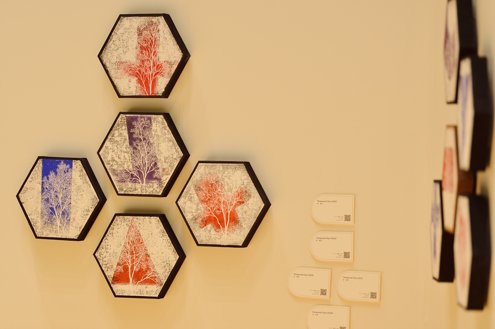 自然の持つ有機的で不規則な形態の魅力を、あえてシンプルな形に落とし込むことにより引き立たせた作品で人気を誇る泉さんは、今回、近年注目を集めるブロックチェーン技術にも着想を得たという作品を発表した。壁面を飾るのは、ハニカム構造のような連続する六角形の画面の数々。中心を持たず、拡散的で、画面が増えるごとに互いに支え合いながら強度を増していくシリーズの構造は、この新しいテクノロジーのあり方を想起させる。
