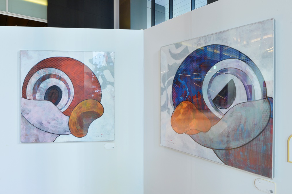 これに対し志水さんは、ブリキの鳥をモチーフとした自身のキャラクター「ブリトニー」を描いた、「阿吽」の如く対となる二枚の絵画を出品する。学生時代に油絵とデザインと日本画を学んだ異色の出自を持ち、日本のキャラクター文化とアートの関係についても長年思いを巡らせてきた志水さんは、以前は枯れた花や古道具を描いていたが、あるとき古いブリキの鳥に生命力を感じ、以後、それをモチーフの軸に作品を作り続けてきた。