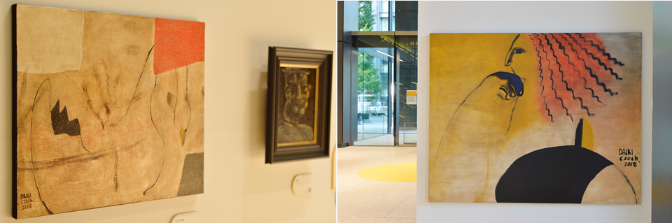 鍛冶橋通り沿いの入り口からエントランスに入ると、真っ先に目に入るのがタカハシマホさんの絵画作品だ。タカハシさんは、作家活動を始めるにあたり、自分の核となるものを自身の幼少期に見出し、それを「あの子」というキャラクターにした。