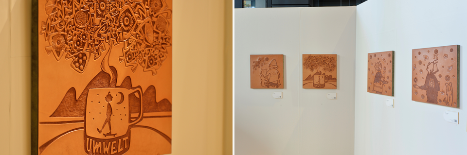つづくスズキシノブさんは、革の彫刻であるレザーカービングを出展する。もともと革の彫刻を制作していたスズキさんは、次第に財布や鞄などの実用品の製作へ。だが、2020年春に革の表現をさらに探求したいと考え、ふたたびレザーカービングを作り始めた。