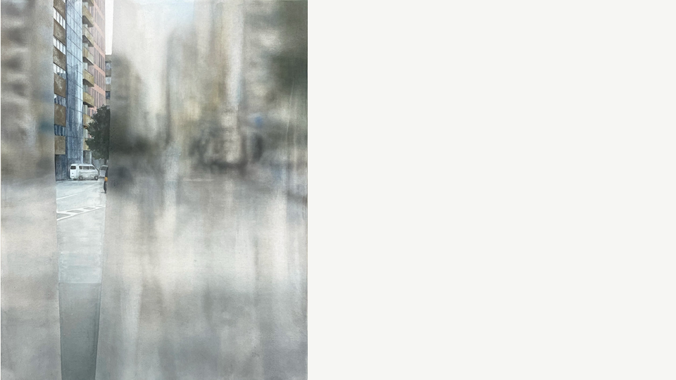 1993年生まれの角谷紀章は、画面の大部分を覆う磨りガラス越しのような風景と、その隙間から覗くクリアな風景を対比させる「Frosted Window」シリーズなど通して、鑑賞者の想像力に働きかけ、見ることの実質を問うてきた作家だ。この画風の背景には、作家が育った時代に加速したテクノロジーの進化に伴う、現実の手触りの喪失があるという。
