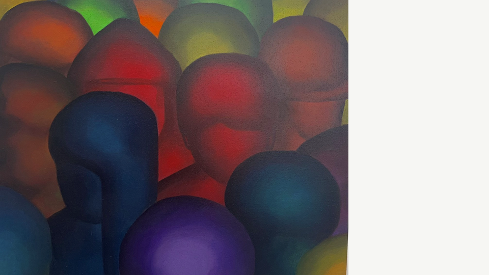 最近はビビッドな色彩を抑え、パステルやグラデーションを多用することで、その隣り合うものの見せる美しさをさらに探求しているという。「僕自身が宝石と絵の具のつながりに感動したように、作品を見る方たちにも、宝石をキーワードに絵の具本来の美しさを感じてもらえたら」。