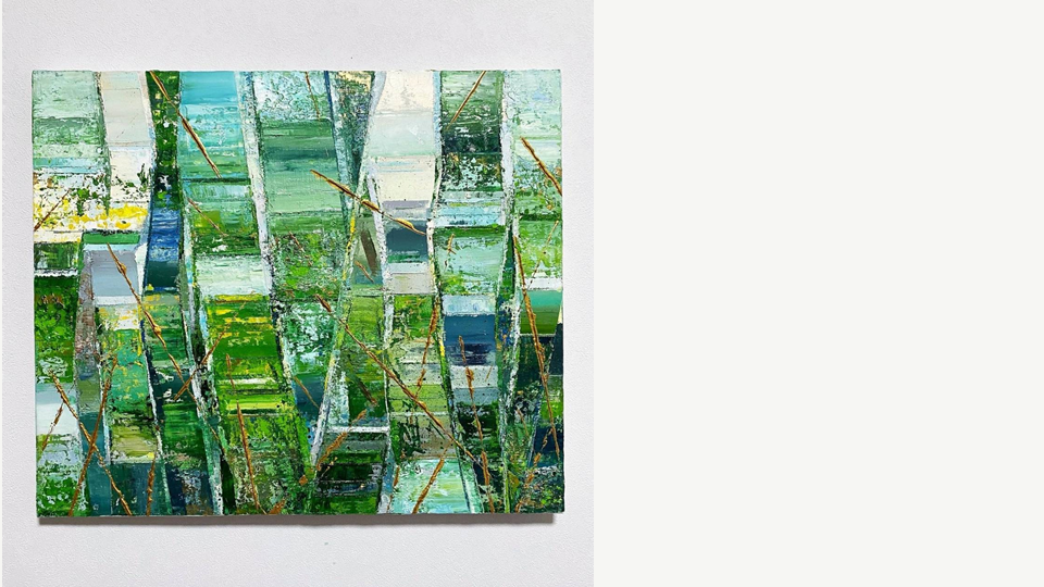 さらに、光を屈折させ、風景を断片化する宝石の結晶は、彼の作品を絵画史の記憶と共鳴させる要因にもなっている。例えば、「近づくと鉱物感や物質感の強い筆跡が見え、離れて見ると風景が立ち上がるあり方は、印象派的。分割された面ごとに異なる風景が隣り合う様子は、画面に複数の視点を共存させたキュビズムを連想させるかもしれません」。