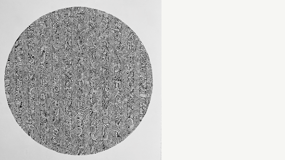 手元にあったペンで描き始めたのは、蠢く細胞を思わせる微細な模様の世界だ。制作に当たり事前に具体的なモチーフは考えず、「無意識のなかで生まれる細胞のようなものがぺンを渡ってキャンバスに生命を宿していくようなイメージで、手が動くままに感覚的に描いていきます」。