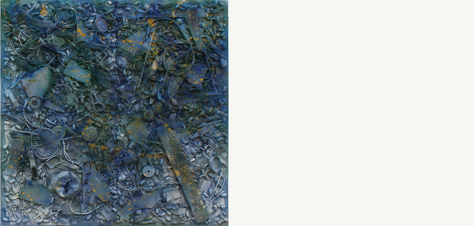 「これはうちの斜め向かいに住んでいた大工のおじさま“まあ爺”が亡くなった時に、家族はなく、残された品々をすべて捨てると聞いて譲り受けたモノを、もう会えないおじさまへの感謝の気持ちを込めて作品にしました。残されたモノたちが海の底に沈み、時間とともに美しく浄化されていく情景をイメージしています」
