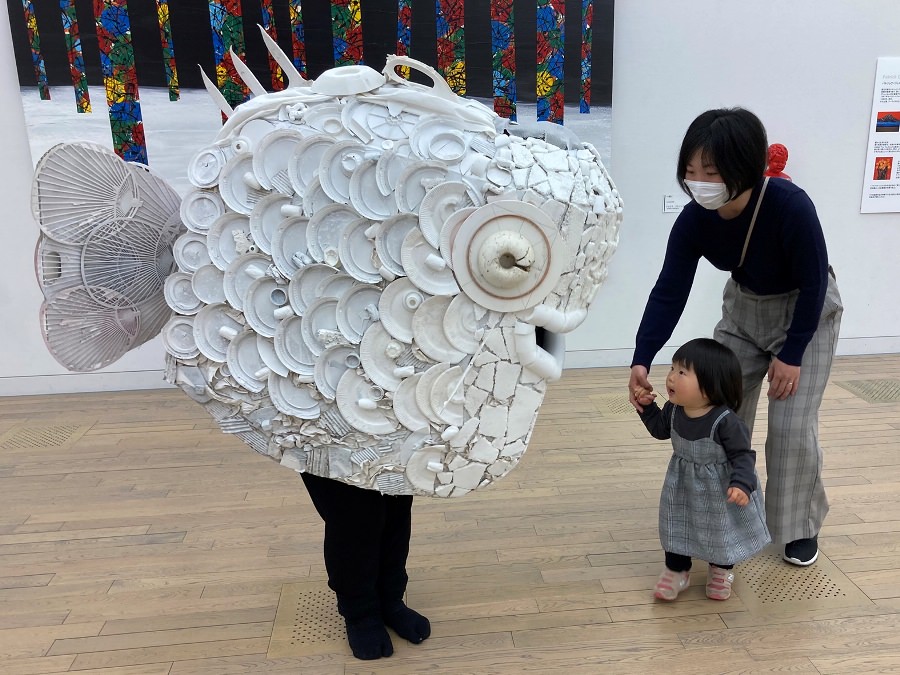 いなずみさんの作品の一つに、世界の果てに住む架空の魚「果て(ハテ)」という着ぐるみアートがある。彼女自身が「果て」の中に入り、時おり美術館の展示作品の前をゆらゆら回遊する。「果て」を見た人に、この愛らしい生物を守るためにも、海洋汚染を止めなくてはと思ってもらえたらと願って。