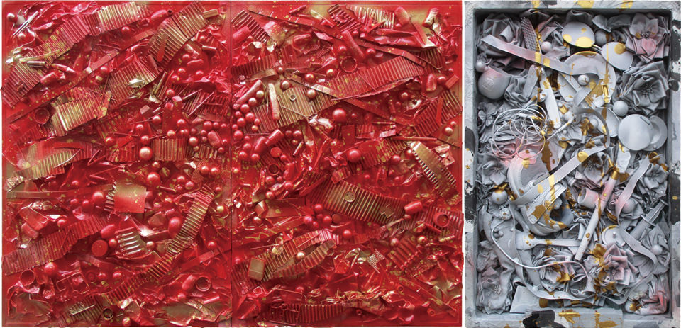 こうしていなずみさんの初作品となったのが、ハンバーガーショップで廃棄されていたのを譲り受けた赤いメニューボードなどに、貯めてきた廃材を飾り、ラッカースプレーを施した『再生 実り』『再生 煌き』だ。その作品には、役目を終えたモノたちの死の静寂とともに、人の営みのにぎやかさがあった。美術品としての美しさと同時に、人の生から切り離せない緊迫感や悲しみがあった。