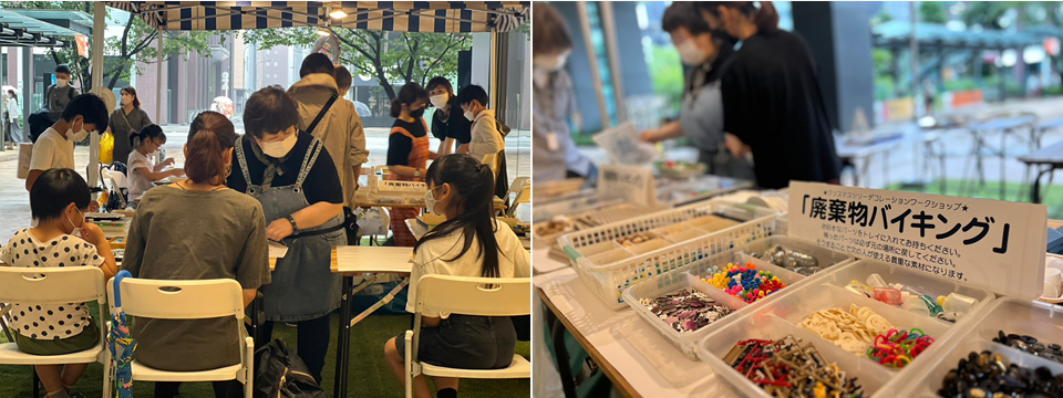 2022年9月に開催された、廃棄物で作るクリスマスツリーオーナメントのワークショップ。子供たちの作品はいなずみさんによって仕上げられ、東京スクエアガーデンのクリスマスツリーのオーナメントの一部に