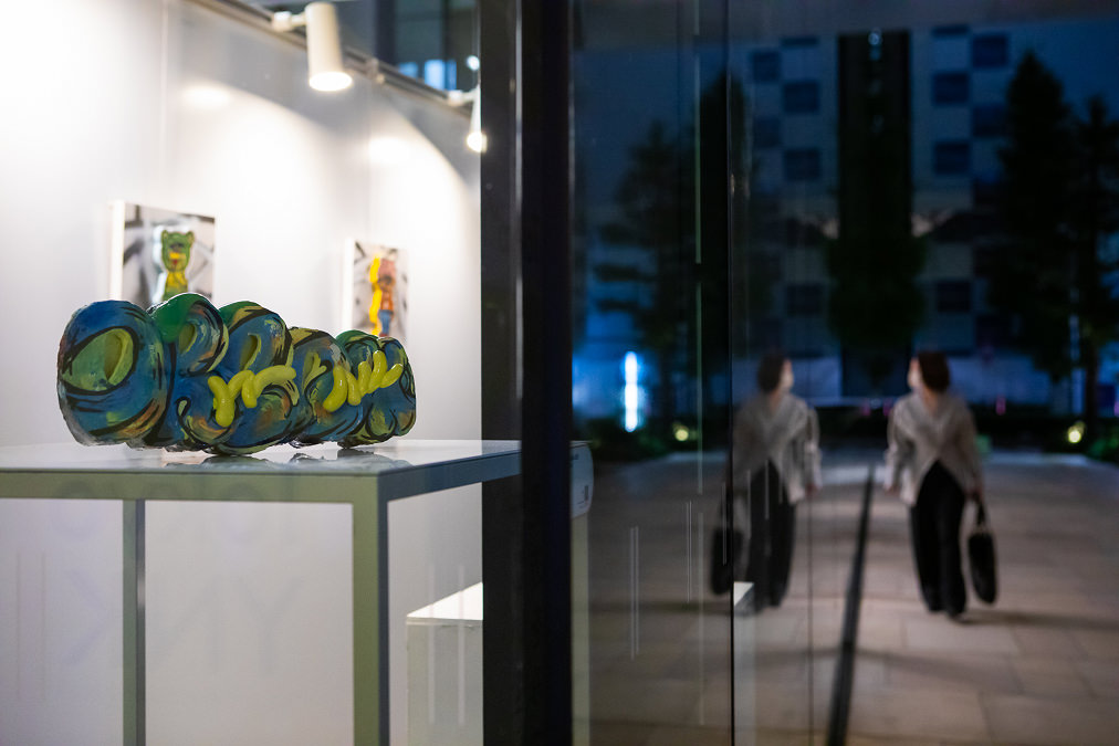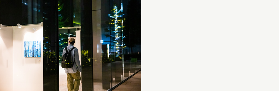 周辺のオフィス就業者が道すがら鑑賞できるよう、ガラス越しに眺めることができる作品も