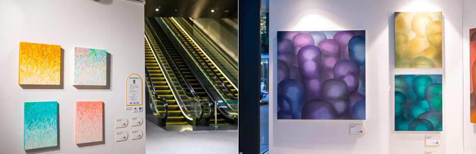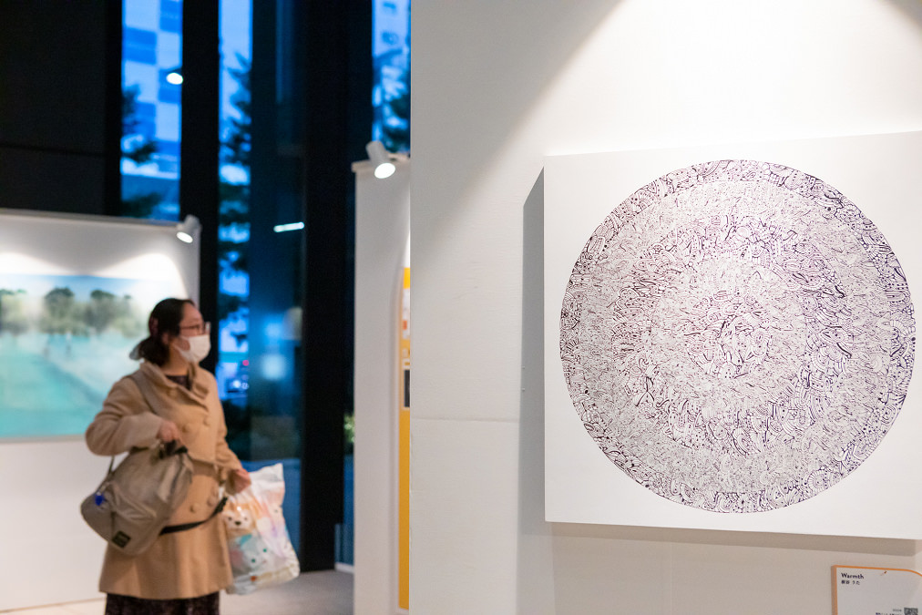京橋駅直結、さらには東京駅、銀座一丁目駅、宝町駅など多方面からのアクセスに対応するよう、建物入口が複数設けられた大型ビルが舞台の「Art in Tokyo YNK」。ビル内の動線は自ずと分散されるため、オフィスエントランスといえど、日常的に人通りは多くなく、人が滞在するようなにぎわいはありません。その光景が変わろうとしているのは、半年に1度のペースで開催を重ねてきた本展の重要な意義のひとつではないでしょうか。