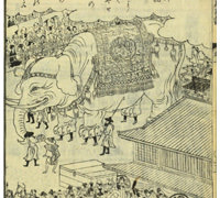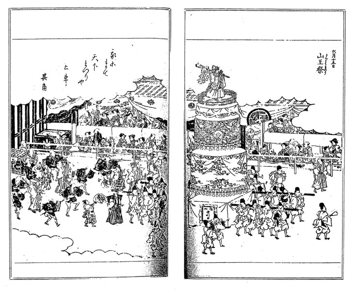 「江戸名所図会」より。「六月十五日山王祭」と題し麴町一丁目の豪華な作り物が描かれる。山王社の使いと信じられていた猿が金色の烏帽子を被り、御幣を持っている。山車の周りは錦繍で包み、華麗な様が伺える。