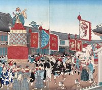 山王祭は江戸時代、一大イベントだった。何しろ将軍家も氏子に持つ、山王日枝神社(当時は日吉山王大権現神社と呼ばれた)の祭りだ。山王祭と同じく“日本三大祭り〟と評された 園祭(京都)、天満祭(大阪)に負けては、将軍の権威にかかわる。五十台以上もの山車が連なる名物の祭り行列は、半蔵門から江戸城内にも繰り込み、吹き上げの庭で将軍の上覧に供して大いに意気を揚げた。市中も大賑わいで、祭り行列の巡行する町筋の商店などには桟敷が設けられ、見物客で埋め尽くされた。