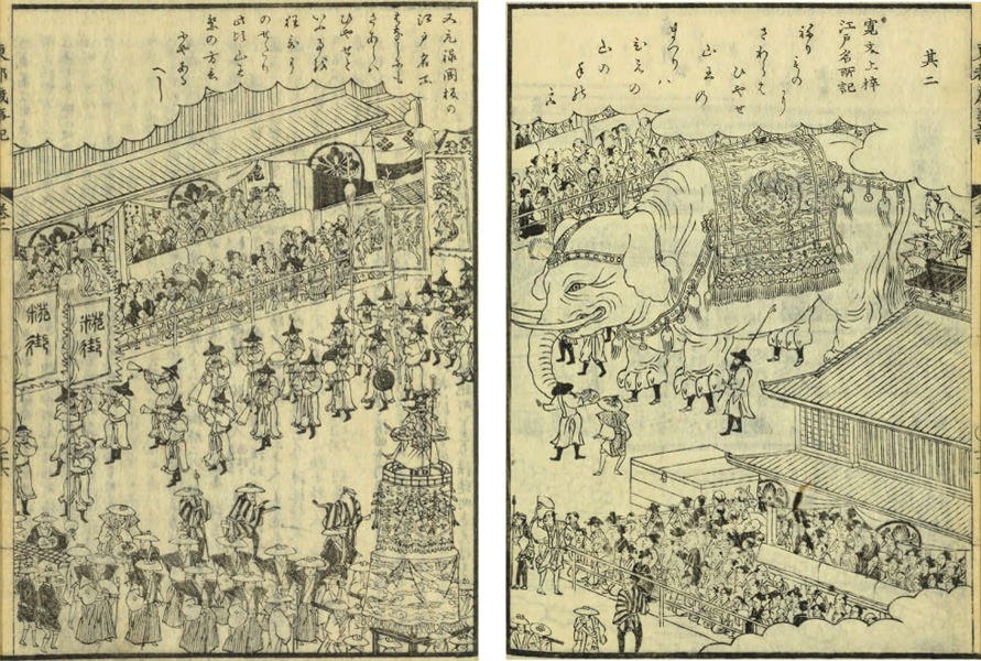 『東都歳事記』(斎藤月岑著、巻之二)より。麹町の巨大な象のはりぼて(曳物)も名物だった。(所蔵・国立国会図書館)