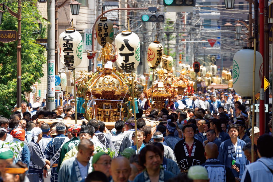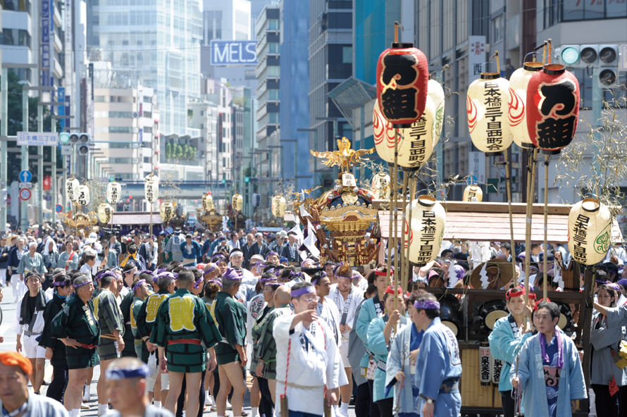 すずらん通り(八丁堀)に連なる神輿。(■)