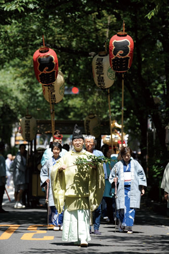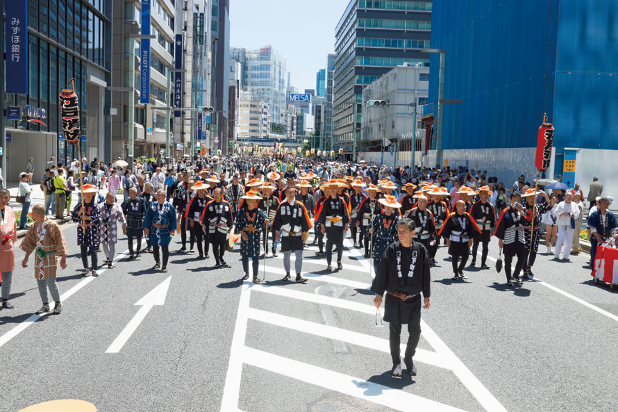 さくら通り(茅場町)の新緑を行く連合渡御。(●)