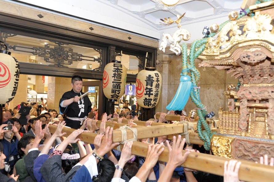髙島屋の正面玄関に、神輿が表敬訪問。(●)
