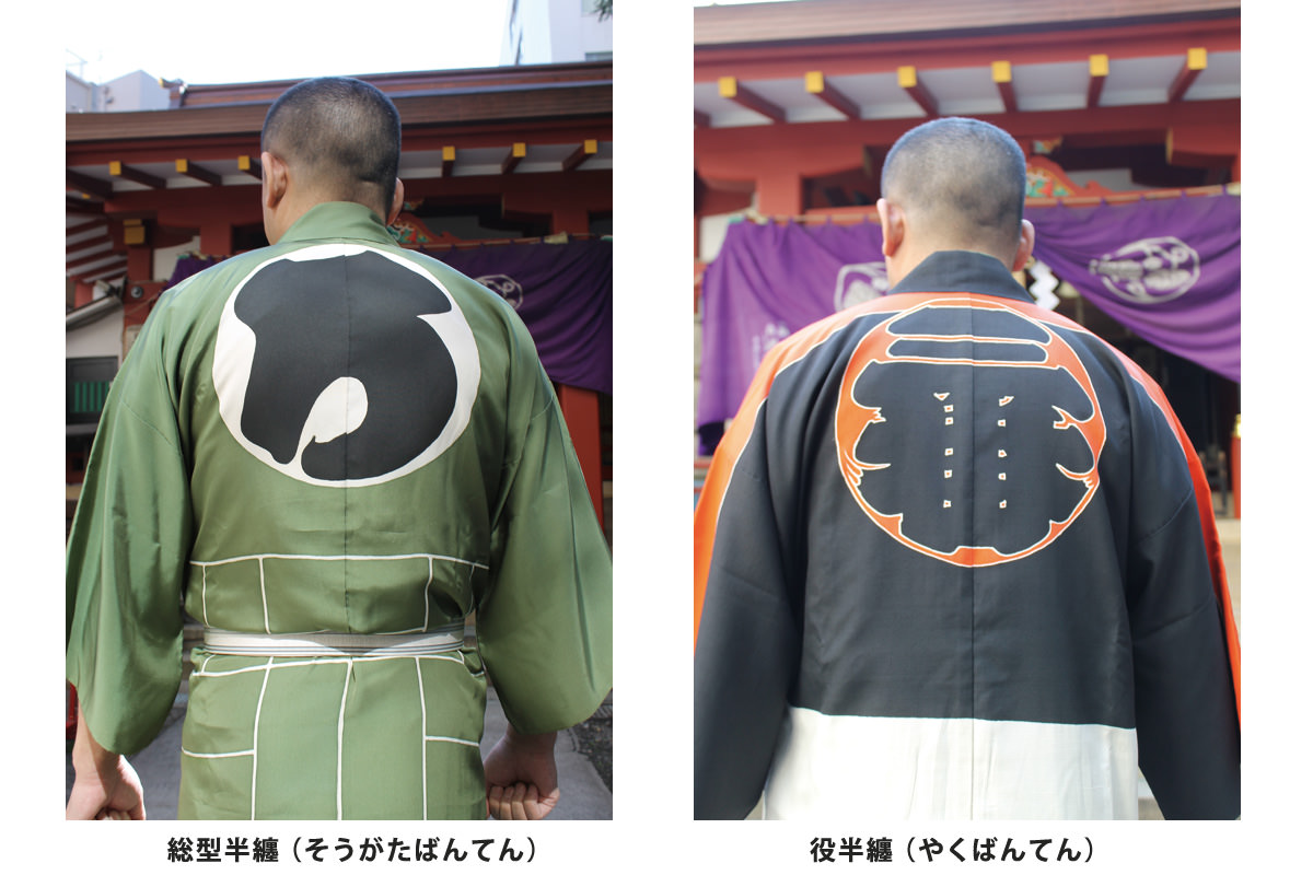(左)江戸町火消しの「いろは四十八組、本所深川南北中十六組」ごとに、独自の図柄があしらわれている。鳶頭は町への誇りから、お祭りのときや、役半纏の下などに好んで着用している。