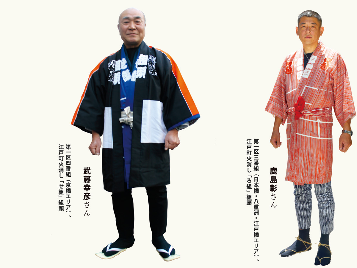 私たちが身近に赤い半纏姿を目にする機会といえば祭礼だろう。かつての、ろ組、せ組で現在「第一区」に分類される日本橋・八重洲・京橋エリアには山王祭という天下祭がある。江戸時代から続く大店「柳屋外池(といけ)本家」の抱え鳶を先祖に持つ「ろ組」(現第一区三番組)組頭の鹿島彰さん、半纏の世界にあこがれて33歳で鳶の世界に入った「せ組」(現第一区四番組)組頭の武藤幸彦さんなどによれば、山王祭を陰になり日向になり支えるのが鳶頭たちだという。御仮屋(神輿を飾る建物)や神酒所の設営、家々の軒につるす軒花提灯架けなど前準備から忙しく、当日の神幸祭(東京の中心部を練り歩く山王祭最大の神事)では御霊をのせた御鳳輦(ごほうれん)を警固し、木遣りの集団が行列の先頭をつとめる。また各町内の神輿や山車の警固や露払い(先導)といった重大な任務を預かる。