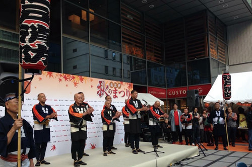 (左)「日八会 秋のお江戸まつり」で、地元の江戸消防記念会一区の鳶頭たちが、木遣りと梯子乗りを披露する