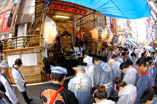 (右)地元の鳶頭が作った「御仮屋」に修められた檜物町(八重洲1丁目)の神輿。山王祭の宵宮で、神職が御霊入れの儀式を行う。(撮影・大八木宏武)