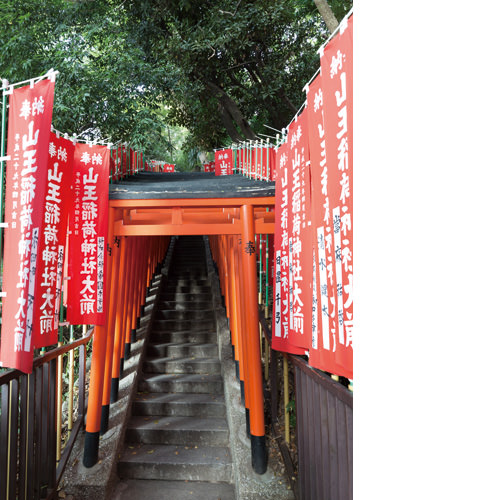 稲荷神社専用の「稲荷参道」があり、朱い奉納鳥居が社に向かって90基並んでいる様子は異次元へのトンネルのよう。本年の例祭は4月20日。