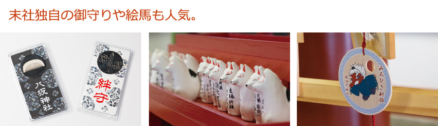 左:八坂神社「絆守」(各800円) 中:山王稲荷神社「御眷属奉納」(800円) 右:猿田彦神社「みちびき祈願絵馬」(800円)