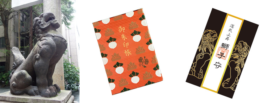日本を代表する金融街、兜町・茅場町に位置することから、「株」と野菜のカブをかけて「かぶ守」を考案。御朱印帳にもカブがデザインされている。金運上昇の御利益を求めて、経営者や投資家などに人気だ。平成30年1月から「子授け祈願の御守」と「獅子守」の授与も開始。当社には出産や災害除けの女神である木花佐久夜比売命が祀られていることから、妊活中や出産を控える女性にご利益を、と考案された。「獅子守」は、境内にある一対の狛犬をモチーフにした。関東大震災の復興と運気上昇を願い、昭和九年に奉献されたもので、天を仰いだ狛犬は全国に数例しかないそう。