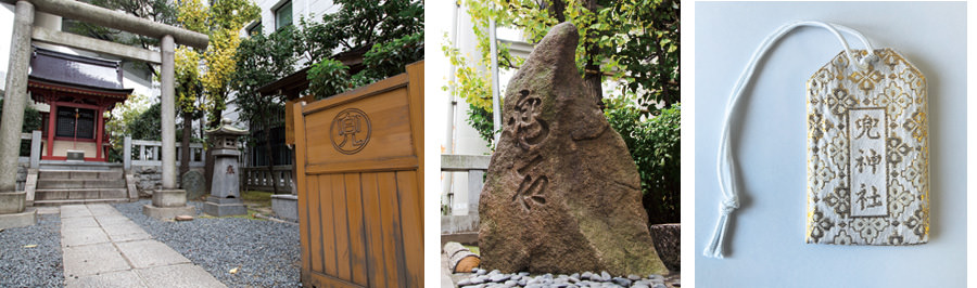 左:兜神社 中:兜石(左、中撮影・渡邊茂樹) 右:兜神社の御守りは、東京証券取引所本館西口で授与。