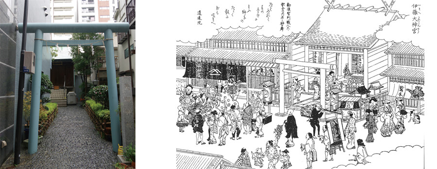 左:天祖神社 右:「江戸名所図会 伊雑大神宮」。江戸時代の賑わいがうかがえる。