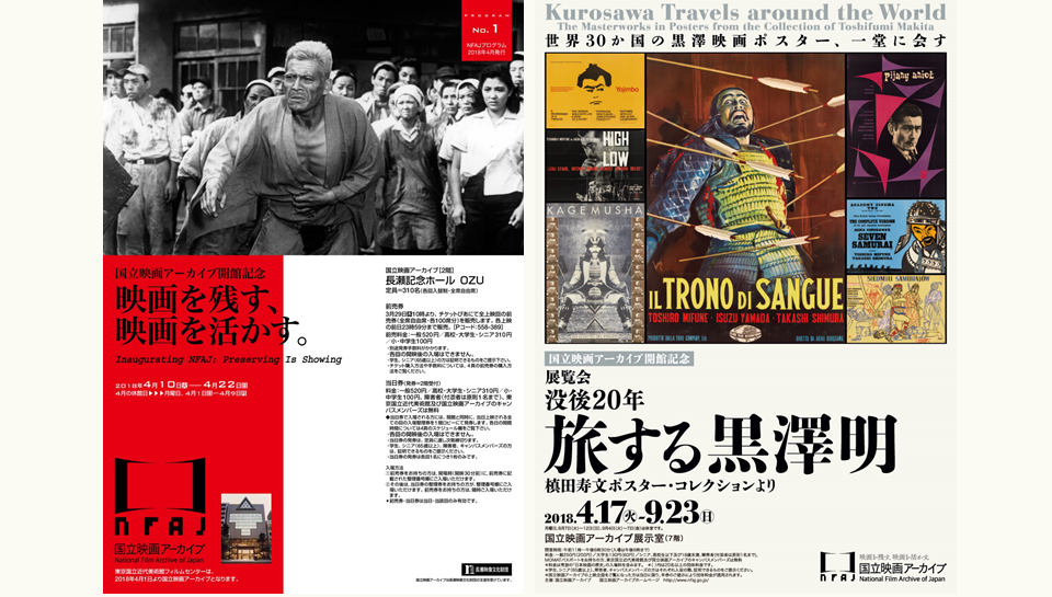左)4月10日からリニューアル後第一弾として上映される「国立映画アーカイブ開館記念 映画を残す、映画を活かす。」のチラシ