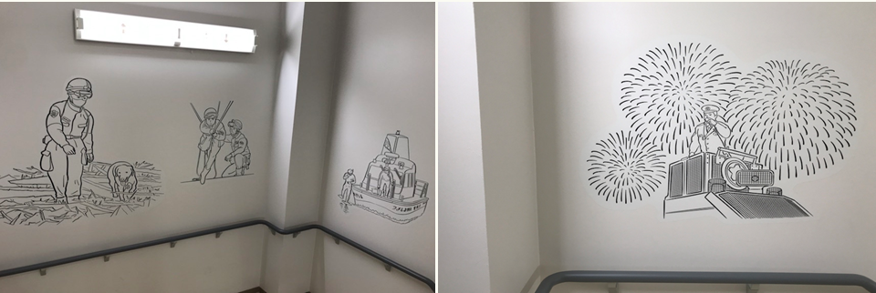 続いては4階へ。階段の壁面には、多岐にわたる警察の活動がイラストで描かれています。