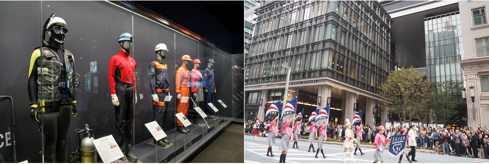 「首都をまもる 〜警視庁の今とこれから」がテーマの4階では、警察の各部門を紹介したブースを見ながら進んでいくと、様々な現場で働く警察官の制服が一堂に会する巨大な展示ケースが現れます。可愛らしいピンクの制服は、警視庁音楽隊カラーガード、通称”MEC”(メック)のもの。MECの皆さんは、先日開催された「第46回 日本橋・京橋まつり ~大江戸活粋パレード~」で地元・官公署団体の一代表として参加していました。