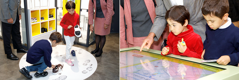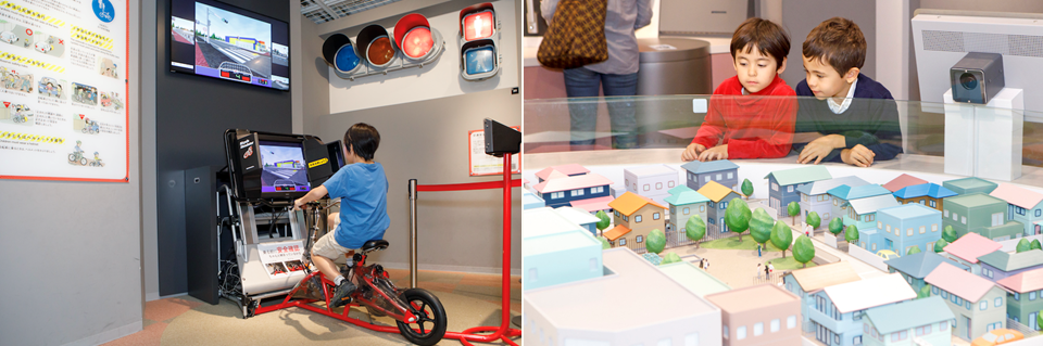 右)フロア中央に大きく設置された「ジオラマシミュレーション」。街に潜む危険と注意すべきポイントを学べます
