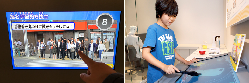 左)捜査が難航中した見当たり調査の画面 右)こちらも人気の体験ゲーム「指紋採取疑似体験」。事件現場に残された物証から5つの指紋を探します。私の前にチャレンジした少年は4つ、私は3つの指紋を発見。10歳に完敗です