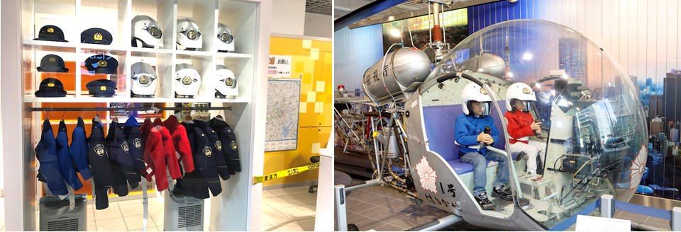 左)子ども制服試着コーナー。制服のほか、白バイ警官の乗車服もあります。サイズの用意は100センチメートル、120センチメートル、140センチメートル、の3サイズ 右)ヘリコプター搭乗体験