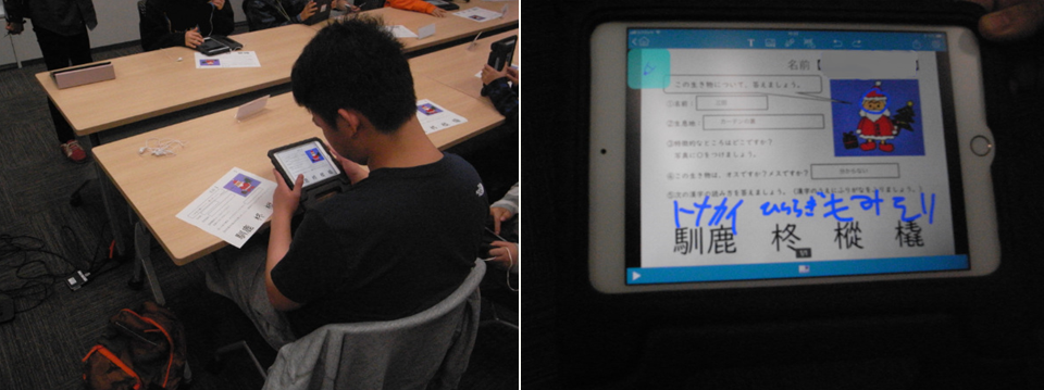 カリキュラムは1コマで1課題をこなすよう組まれており、取材時に生徒たちが取り組んでいた課題は「プリントに書かれた漢字を調べて書き込む」というもの。各々タブレット端末を使い、まず、課題のプリント用紙を「カメラで撮影」。その後、撮影した画像を「形補正」、出題の漢字を「辞書アプリで調べ」、答えをプリントに「入力」。最後に、回答を講師に「メールで送信」する。