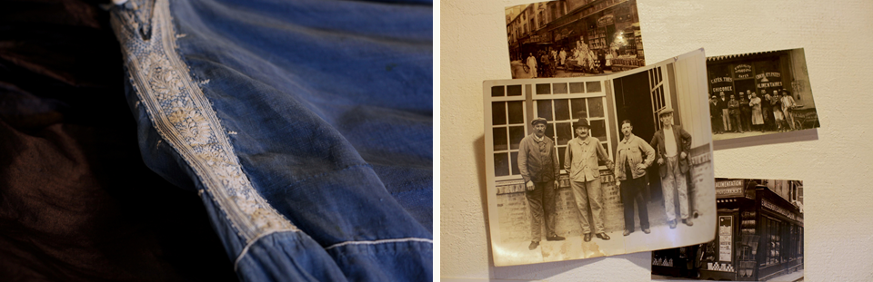 「たとえば、これは100年前に家畜商が着ていたスモックですが、大変手間をかけて作られています」。ふたりが愛おしそうに説明してくれる商品は、仕事着といえども、刺繍やレースの装飾を施していたり、肩から柔らかいふくらみを持たせたシルエットに仕立ていたり、丁寧な手仕事が見て取れる。しかも、当時の紡績技術で作られたコットンやリネンは、現代までよいコンディションで残るほどの丈夫さを持ち合わせている。