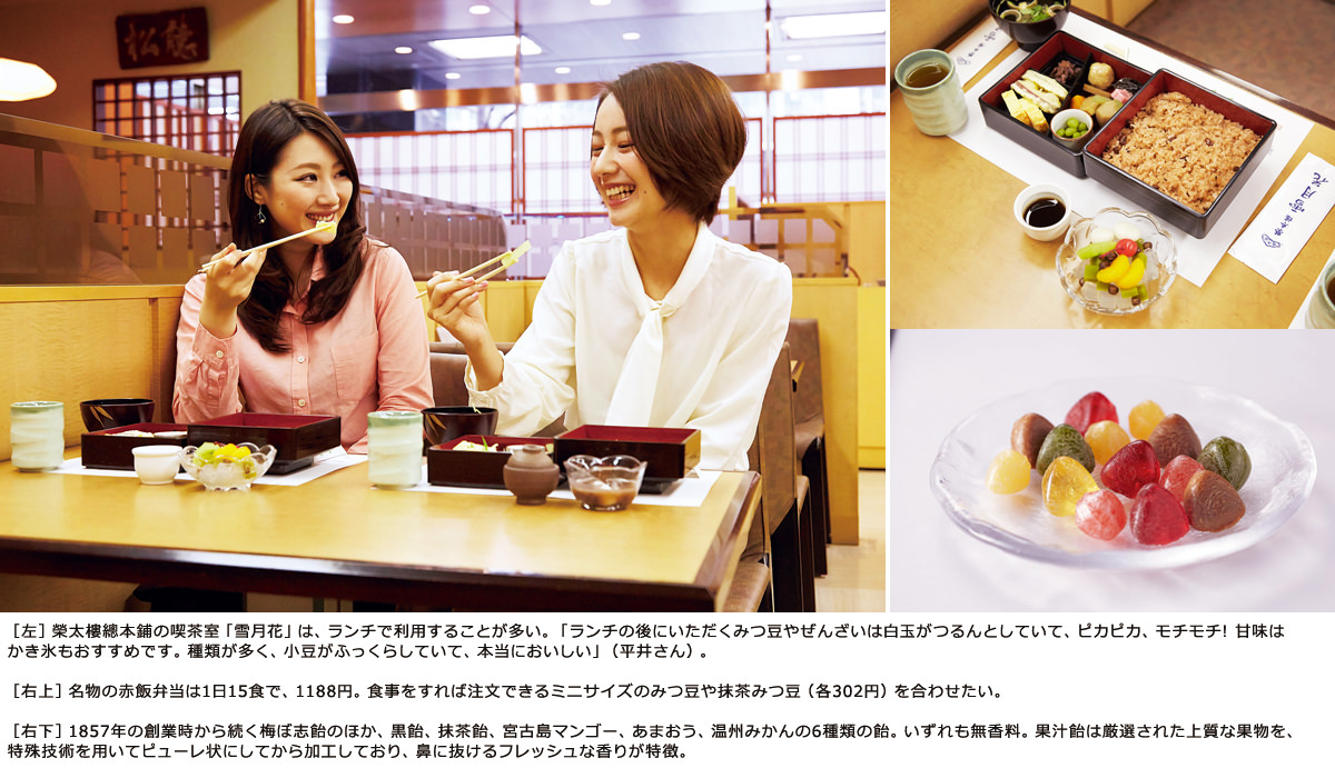 1857(安政5)年創業、江戸菓子の老舗・榮太樓總本鋪日本橋本店にて。店長の斎藤喜幸さんに商品の特徴を聞く平井さん(左)と比毛さん(右)