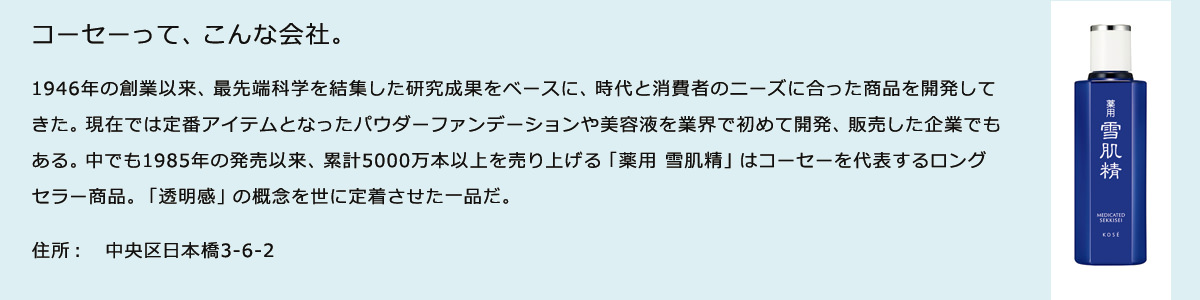 2016年春に創業70周年を迎えたコーセー。同社が創業の地である北区王子から、日本橋に本社を移したのは1965年のことだ。当時から銀座・日本橋はファッション・文化の中心であったこと、また近隣に薬品・化学系の企業が多く、利便性が良いことなどが移転の決め手となったという。そして現在、同社の宣伝部で働く女性たちも、日本橋で働くことを日々満喫しているようだ。