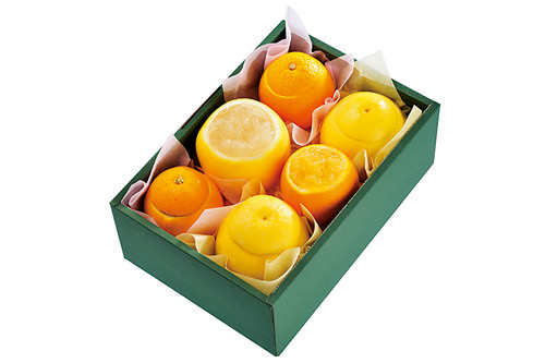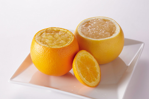 オレンジとグレープフルーツのフタ部分を外すと、現れるのはぷるんぷるんのゼリー。果実をくり抜き、しぼりたての果汁をゼリーに仕立てたもので、30年以上前から販売され、毎月それぞれ5000個以上は売れるという人気商品だ。食べる前にフタの部分の果汁を絞りかければ、香りとみずみずしさが際立ち、さらに美味しくいただける。