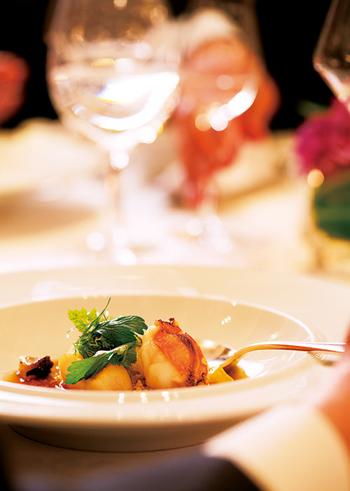 シチリア出身のシェフ、アンジェロ・プミリア氏が手がける料理は、まるで芸術作品のような美しさ。シチリアのフルーツや野菜、旬の国産有機野菜をたっぷり使った色鮮やかな料理が、ひと皿ずつ少量で供される「デグスタッツィオーネ・コース」は、日本の懐石料理の文化を取り入れたもので、7~9皿の多彩な味を満喫できる。
